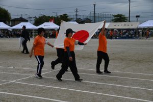 入場行進がスタート、国旗を先頭に羽島市旗、体育振興会旗に続き